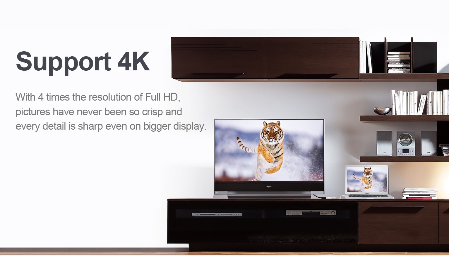 Support 4K resolution, 4 times the resolution of Full HD.- The pictures on screen have never been crisp and every detail is sharp even on bigger display.
