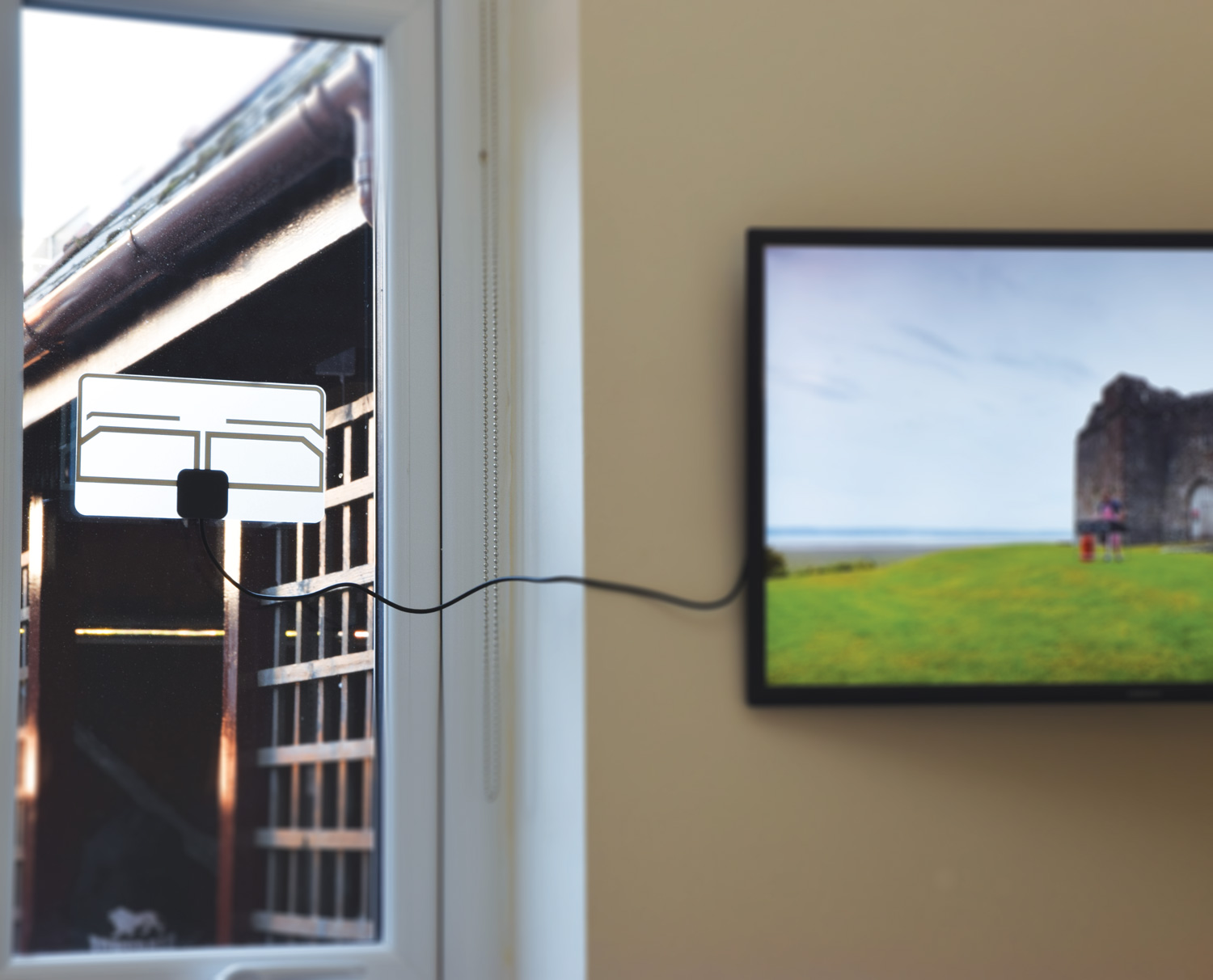 - Lightweight, paper-thin aerial that can be fixed either to a window or an outside facing wall